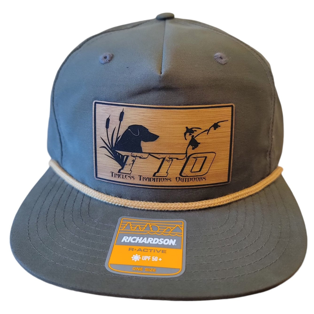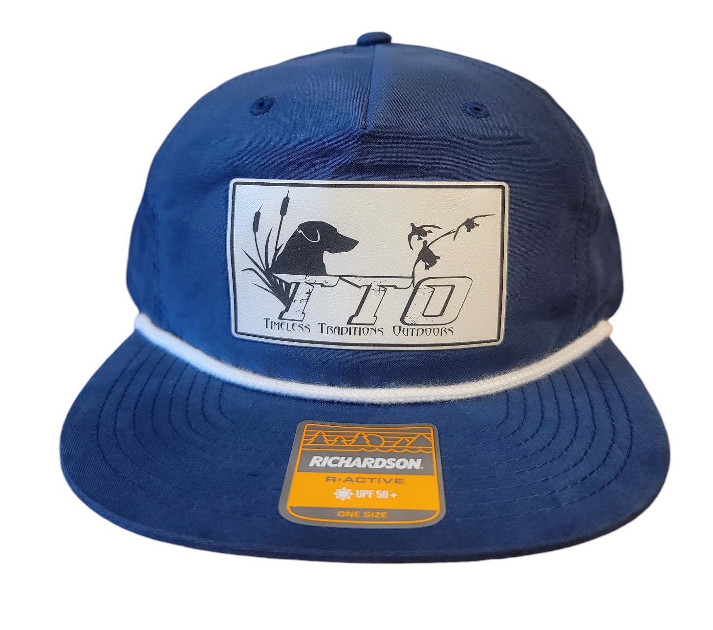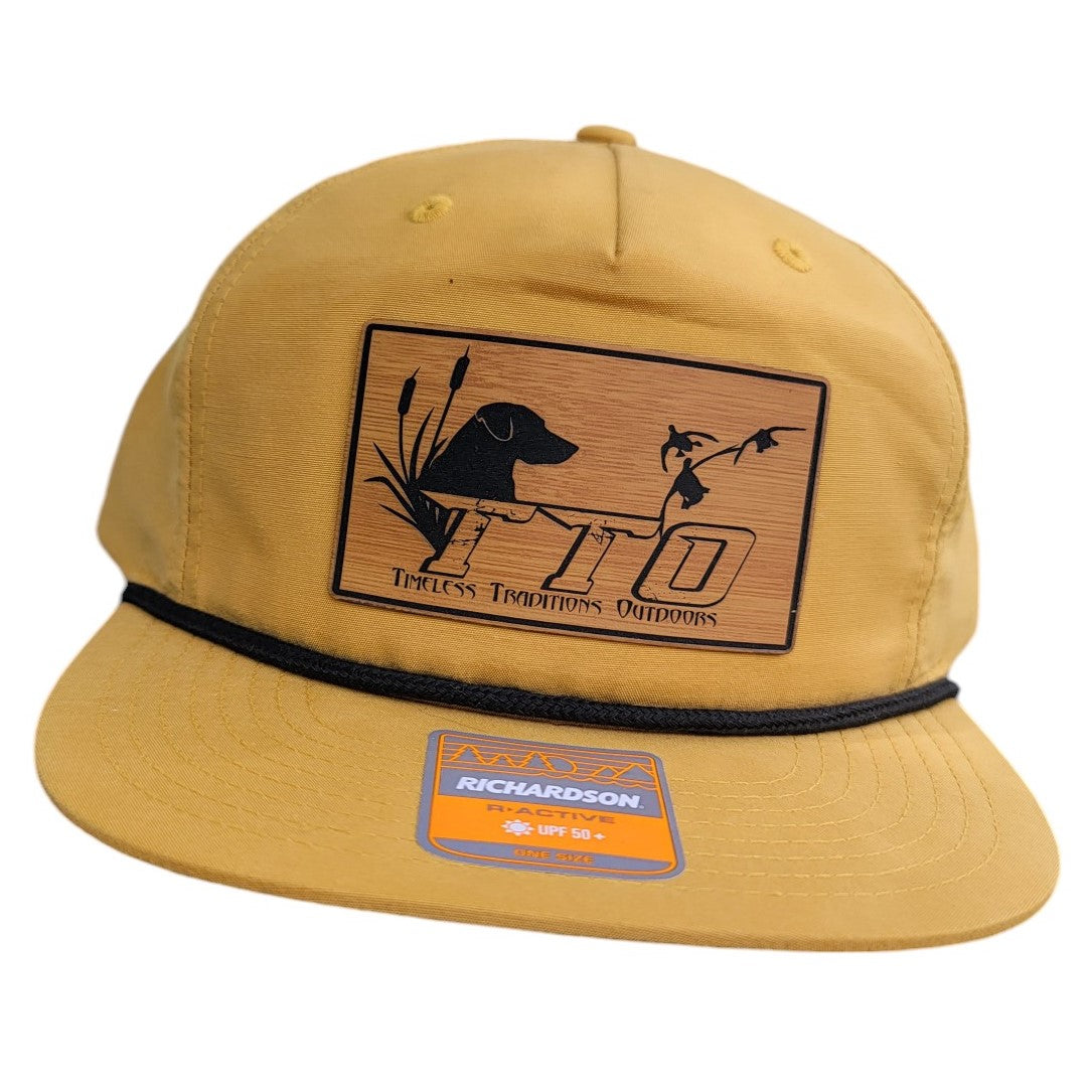 High quality Richardson modern cap design with its mesh flip-up stay, flat bill, lightweight construction, classic Hi Pro crown, and UPF 50+ rating featuring the TTO Duck Dog Logo